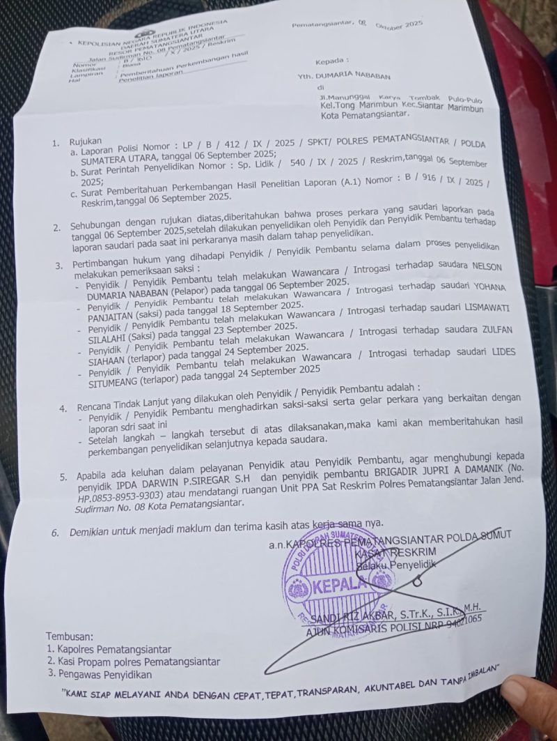 Merasa nama baiknya tercoreng dan reputasinya hancur akibat tudingan keji, Dumaria br Nababan secara tegas melaporkan ZP br Siahaan dan LD br Situmeang ke Polres Pematang Siantar. Laporan polisi dengan nomor B/412/IX/2025/SPKT/POLRES PEMATANG SIANTAR/POLDA SUMATERA UTARA ini diajukan pada tanggal 6 September 2025, menyusul insiden fitnah dan pencemaran nama baik yang terjadi pada Jumat, 22 Agustus 2025.