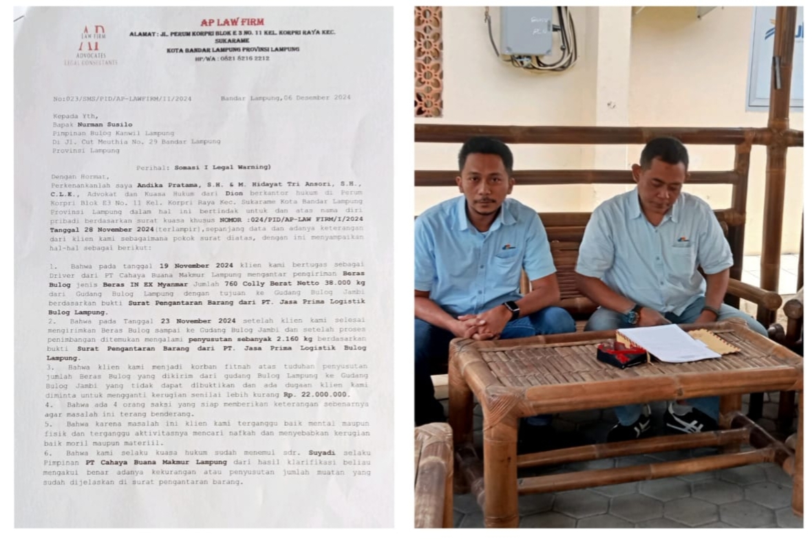 “Selang Beberapa Hari kemudian (Aaqyud) Kepala Jasa Prima Logistik (JPL) Bukog memenuhi panggilan pada (04/12/24) dikantor hukum AP LAWFIRM jl. Perum korpri blok E3 no. 11 sukarame kota Bandar Lampung untuk klarifikasi. Ia mengatakan untuk permasalahan claim dari 760 sak/38.000 kg yang pemenyusutan berat 2.160 kg akan dilimpahkan ke PT. Ceng Jie Expedisi lampung karna ia yang berkontrak ke JPL Bukig, dan PT Ceng Jie Expedisi Lampung akan meng claim PT. CBM, kemudian dari pada itu lebih jelas Kepala Kanwil Bulog Lampung yang bisa menjelaskan dan bertanggung jawab dalam persoalan ini,” kata Nurullah berdasarkan keterangan para tim PWDPI.