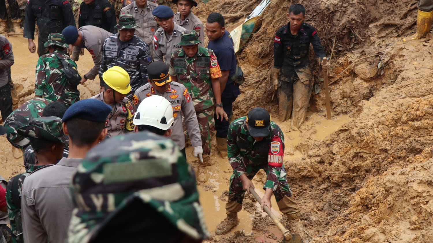 Personel Kodim 0316/Batam bersama warga membersihkan puing-puing dan lumpur pasca tanah longsor di Perumahan Tiban Koperasi, Kelurahan Tiban Baru, Sekupang, Batam, pada Jumat (17/01/2025). Bencana yang terjadi sejak Senin (14/01/2025) itu memicu respons cepat dari TNI untuk memulihkan kondisi lingkungan.