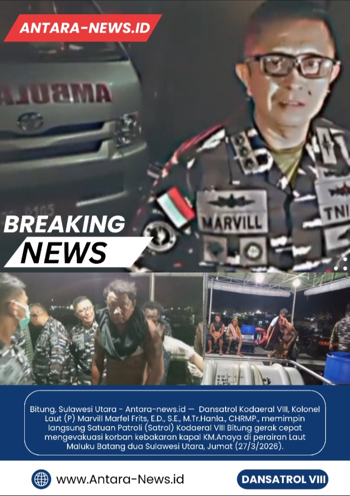 Bitung, Sulawesi Utara – Antara-news.id — Dansatrol Kodaeral VIII, Kolonel Laut (P) Marvill Marfel Frits, E.D., S.E., M.Tr.Hanla., CHRMP., memimpin langsung Satuan Patroli (Satrol) Kodaeral VIII Bitung gerak cepat mengevakuasi korban kebakaran kapal KM.Anaya di perairan Laut Maluku Batang dua Sulawesi Utara, Jumat (27/3/2026).