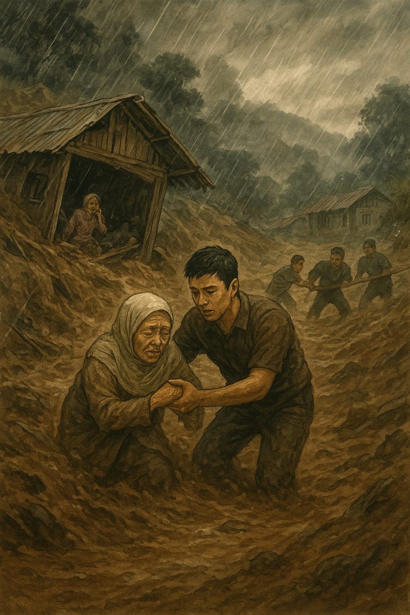 Beberapa laki-laki segera datang. Mereka membentuk barisan, saling berpegangan agar tidak hanyut. Rafi menerobos masuk ke rumah yang hampir tertimbun. Dengan senter kecil di tangan, ia menemukan si nenek duduk di sudut ruangan, tubuhnya bergetar.