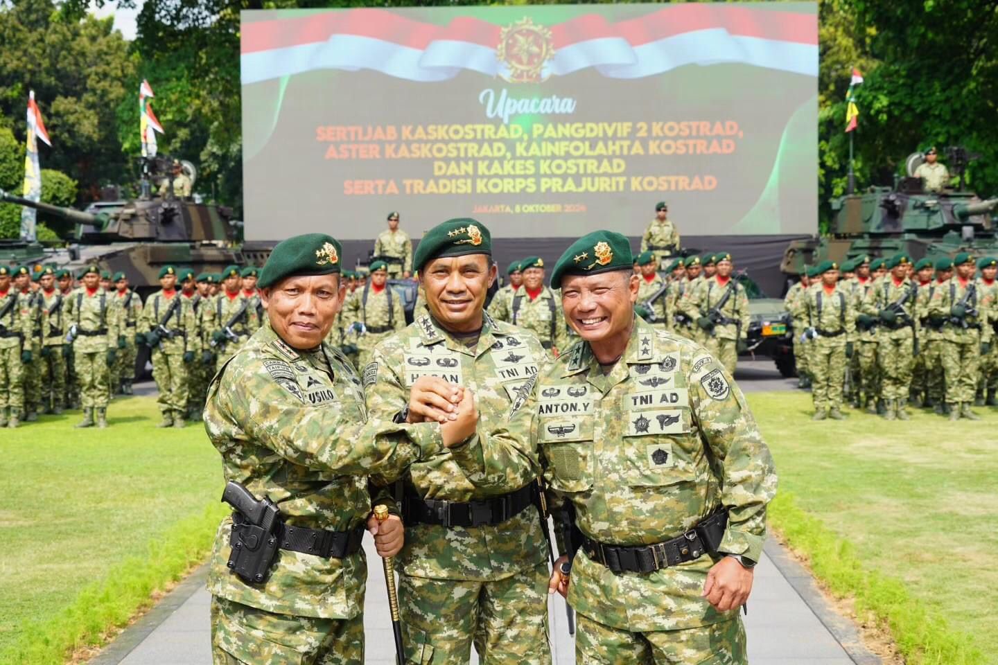 Panglima Kostrad (Pangkostrad) Letnan Jenderal TNI Mohamad Hasan memimpin langsung upacara serah terima jabatan (Sertijab) Panglima Divisi Infanteri 2 Kostrad, dari Mayjen TNI Anton Yuliantoro, S.I.P., M.Tr.(Han)., kepada Mayjen TNI Susilo, yang berlangsung di Lapangan Upacara Markas Kostrad, Gambir, Jakarta Pusat, pada Selasa (08/10/2024).