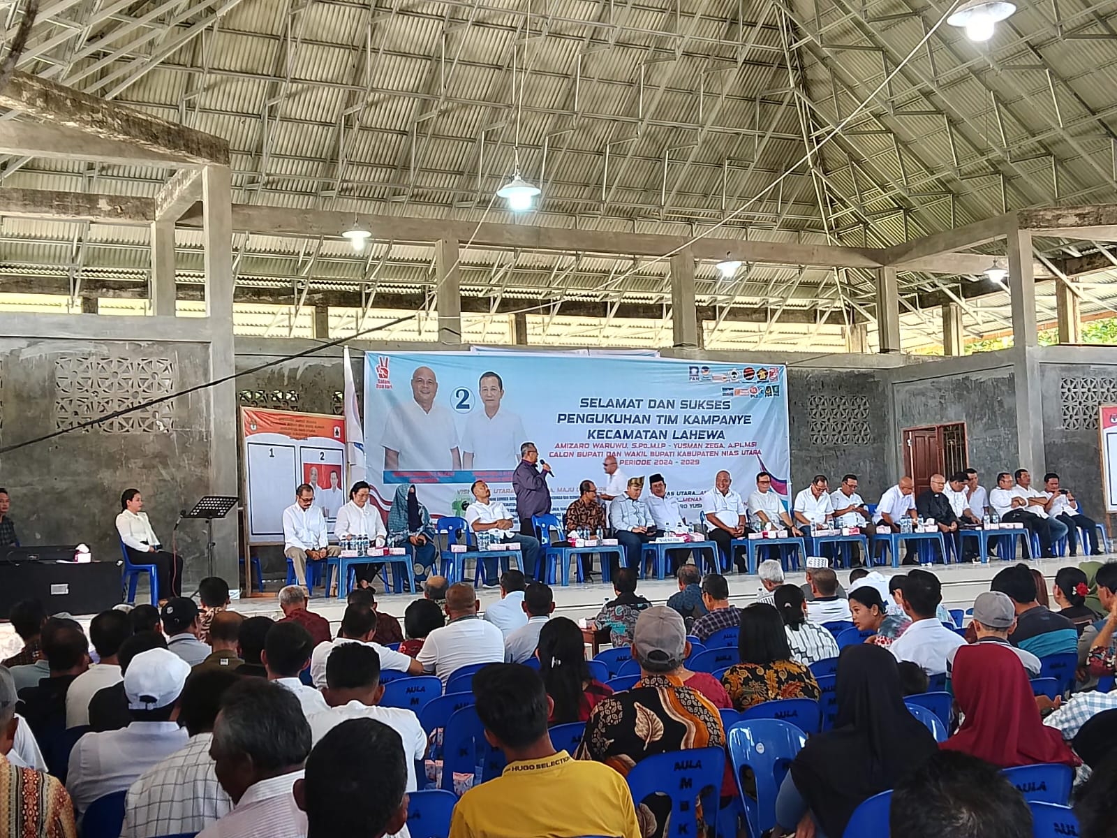 Pembacaan SK Tim Kecamatan Lahewa Oleh Sekretaris Tim Kabupaten Nias Utara Bedali Lase, S. Pd.K, Ketua Tim Pemenangan Pasangan Aman Kecamatan Lahewa Herman Lahagu mengatakan “Hari ini sudah di berikan tanggung jawab sebagai Tim di Kecamatan Lahewa yaitu untuk memenangkan pasangan Amizaro Waruwu dan Yusman Zega di kecamatan Lahewa, kita seluruh tim dan kita masyarakat di kecamatan Lahewa mari kita saling bahu membahu memilih mereka menjadi pemimpin yang dapat merubah Nias Utara lebih baik di kecamatan Lahewa, apa yang telah dilakukan pasangan aman selama ini salah satunya pembangunan pasar bertingkat yang nilai anggaran nya puluhan Milyar rupiah begitu juga dengan pembangunan lainnya yaitu jalan dari simpang KUD menuju Desa Ono Zalukhu dan jalan Dari Desa sihene Asi dan banyak lagi di bidang lainnya” Lahewa Boi talulu.*