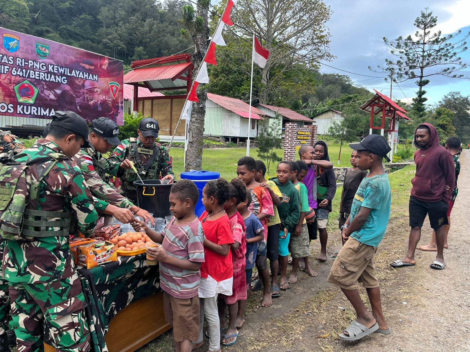 Dengan memberikan kacang hijau, telur rebus, dan snack gratis kepada anak-anak di Desa Eroma Distrik Kurima, Kabupaten Yahukimo, Provinsi Papua Pegunungan, Satgas Pamtas RI-PNG Kewilayahan Yonif 641/Beruang membantu meningkatkan nutrisi anak-anak Papua. (2/11/2024).